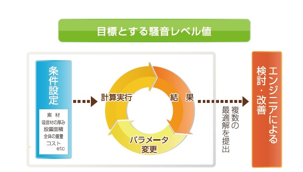 先ほど述べたとおり吸音設計はある意味、「回数勝負」ですが、それには莫大な時間と工数が必要になります。そこで、「下ごしらえ」の部分はソフトウェアに自動計算させ、エンジニアは「仕上げ」を行うとプロセスが合理的です。
