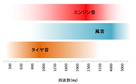 エンジン音のうち「聞かせたい音」は、500Hz以下の低周波に多く含まれています。一方、クルマ本体が発する不快音、つまりタイヤ音、風切り音、そしてエンジン雑音は、いずれも1KHzを超える高周波帯にピークがあります。ということは、これら不快音を遮断しても、心地よいエンジン音を車内に取り入れることができます。