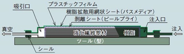 フィルムバッグ内部の空気を抜いて、真空圧により、炭素繊維の層、フローメディア、フィルムを相互に密着させます。 -