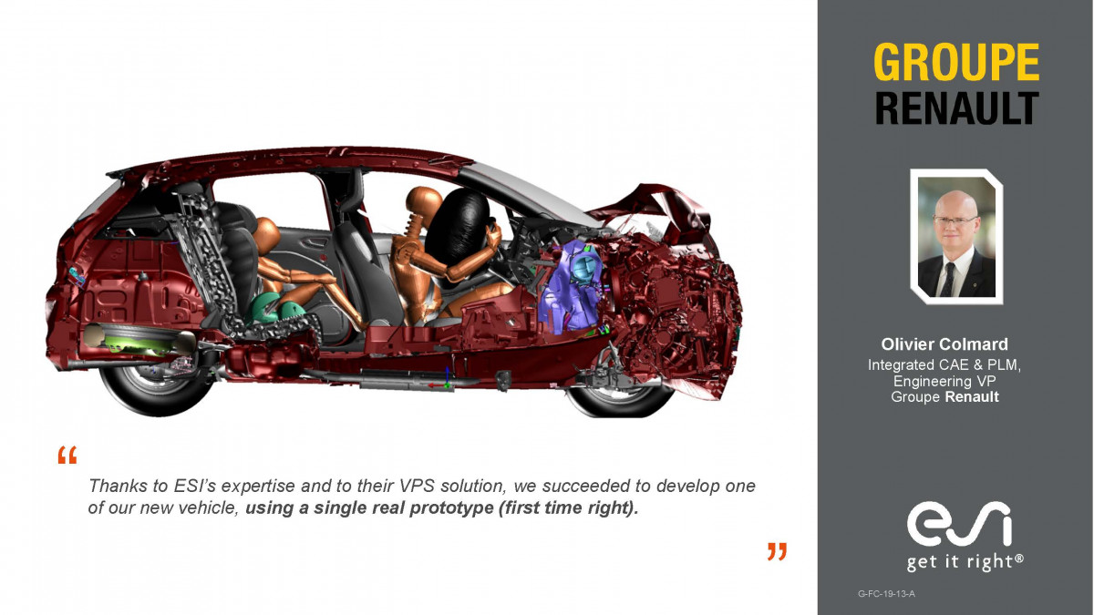 The certification of a vehicle with a single physical prototype is a world premiere. It is as significant as the first virtual crash-test that was realized by ESI’s founders in 1985. This achievement positions Renault Group among the leading automotive industrials, equipped to seize the opportunities presented by the future of mobility. Thanks to this accomplishment, ESI meets its vision: to allow industrials to virtually manufacture their products with zero physical tests, zero physical prototypes, and zero unpredicted downtime. ESI provides a global answer to the increasing requirements of the automotive industry: innovate while producing faster, with more reliability and less cost.
