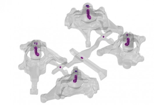 Fonderie de Bretagne (FDB) joined the Renault Group in 2009 and is now a wholly owned subsidiary. The company produces rough and machined parts in spheroidal graphite cast iron and other materials. Renault has made a considerable investment in installing a new molding line at FDB. In the scope of commissioning the new line, Renault decided to standardize their production methodologies and to use simulation early in the development cycle. This meant devising a standard for creating molding layout and feeding design that could be replicated across a wide range of casting products. For the pilot project, they chose an existing 6-cavity mold layout of a cast iron knuckle; one already in production but experiencing some noticeable shrinkage porosity problems.