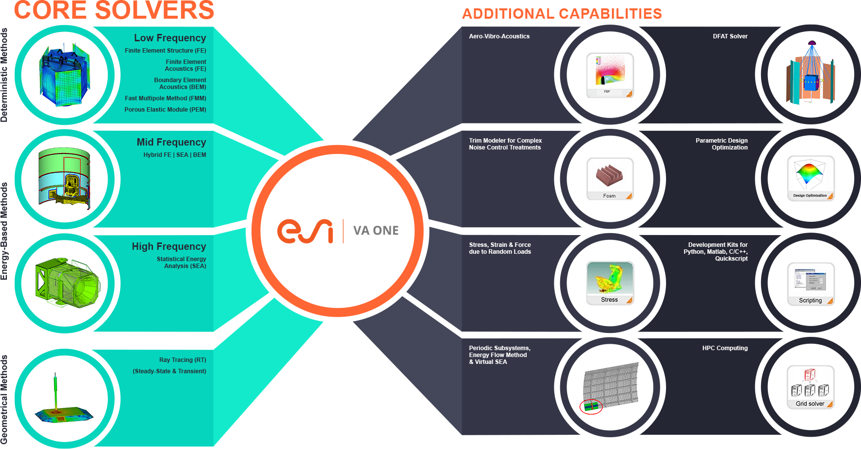 VA One은 저/고주파수 문제를 시뮬레이션하는 올인원 솔루션으로, 유한 요소 모델링(FEM), 경계 요소 모델링(BEM) 및 통계적 에너지 분석(SEA)을 위한 기능을 제공합니다. 레이 트레이싱 및 DFAT® 모듈을 포함한 특정 모듈은 인증 목표를 달성하는 데 도움이 됩니다.