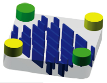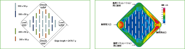 ChemLabの設計は、CFD-ACE+ を用いてプリコンセントレータの性能をシミュレートすることで、大幅に合理化されました。たとえば初期設計のままでは、流体が、各支柱により生じる障害を避けようとして、プリコンセントレータの両端に沿って勢いよく流れてしまうこと、つまり流れと支柱の接触が非常に少ないことが予め分かったので、この問題点を解決するために、まず支柱の配列を見直すことになり、具体的には、まずプリコンセントレータの側面に沿う逃げ道を塞ぐように支柱が再配置されました。この構想は、ガス流が支柱の列の中を強制的に通過できるようプリコンセントレータのあらゆる部分に支柱を配置することでまず現実化。その後、変更した形状に対してシミュレーションを再実行したところ、吸着支柱との接触が大幅に増え、流れのプロフィールが大きく改善されることが分かりました。