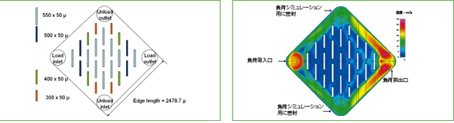 プリコンセントレータの設計においては、吸着面上の分析対象物を最短時間で最大量、収集する必要があり、またセンサーが的確に対象を検出できるよう、分析対象物の流れに鋭いピークを与えることも必要ですが、いずれも困難な課題です。設計の際のパラーメータとなるのは、プリコンセントレータの形状、吸着工程および脱着工程における質量流量レート、吸着工程および脱着工程での搬送ガス、吸着および脱着での動力学、脱着温度プロフィールなどですが、 ChemLabのようなマイクロ流体装置は、サイズが小さいため、局所的な流量の測定に必要なセンサーを取り付けることがほぼ不可能であり、従来のような試作と試験を繰り返しながら設計することは、きわめて困難です。この場合、技術者は、設計を改善しようとする際に、自身の直感と推測を頼りにせざるを得ません。